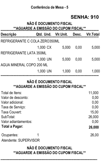 Será impresso uma conferência de tudo que foi consumido, totalizando valores de Couvert e Taxa de Serviço (quando possuir).