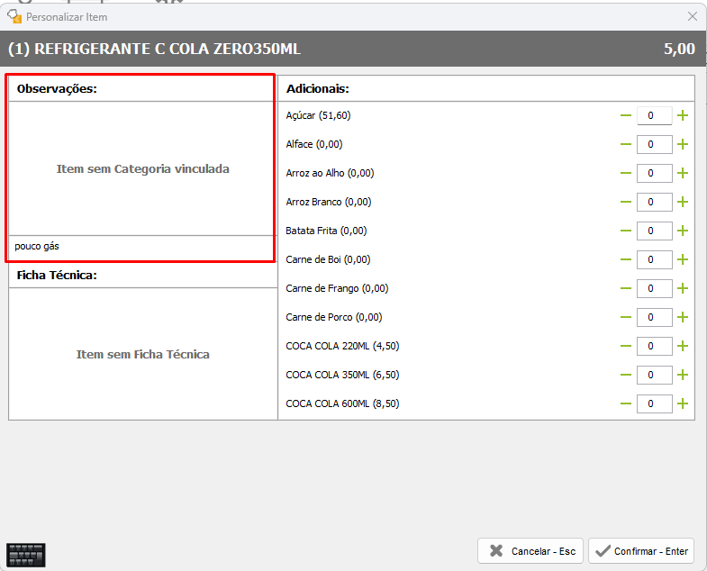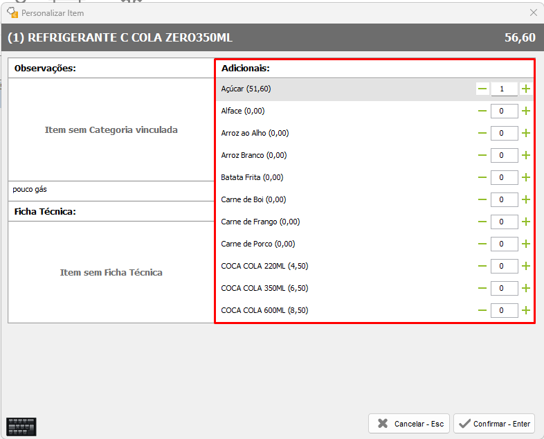 Poderá personalizar observações, adicionais no item lançado, clicando sobre o produto lançado e em seguida nesta opção. Também é possivel informar adicionais com preço fixo.