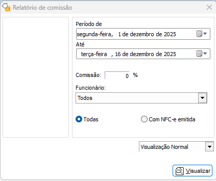 Escolha o período, percentual de comissão, atendente para exibição dos valores e escolha se deseja comissionar por todos os lançamentos ou somente com NFC-e emitida;