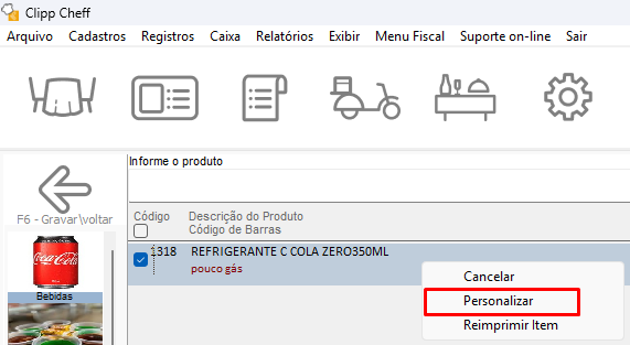 Para lançar o adicional, clique no produto com o Botão direito > Personalizar. Ou também pode ser lançado atráves do menu inferior no botão