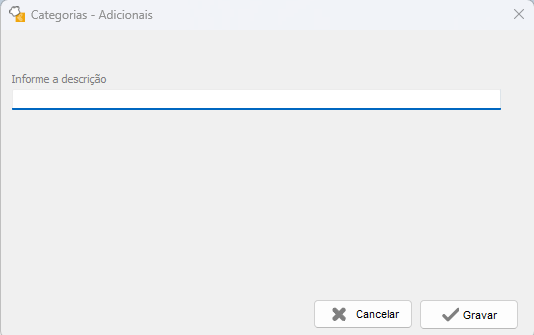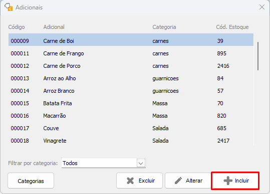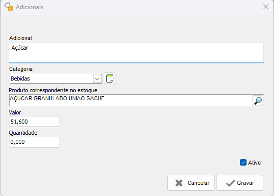 No cadastro do adicional, adicione um nome, lance a categoria, produto correspondente no estoque (que será efetuada a baixa da quantidade) valor e quantidade. Após informar esses dados, clique no botão Gravar.