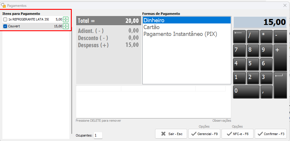 Nessa tela, você pode selecionar qual a forma de pagamento e o valor que deseja adiantar. Também é possível selecionar apenas o item que consumiu para o pagamento no canto esquerdo.