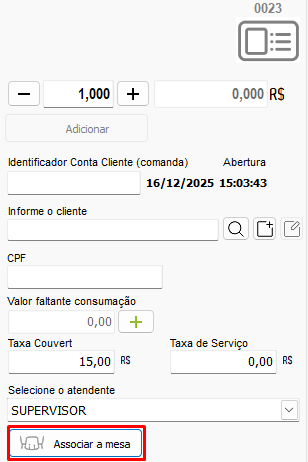 Para realizar a vinculação, basta acessar as comandas e abrir a comanda do cliente em questão, em seguida, clique no botão Associar a mesa;