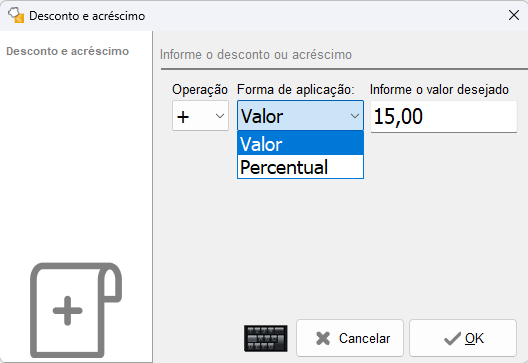 Na função de acréscimo e descontos é possível adicionar acréscimo ou conceder descontos no pedido, é possível lançar em Valor (R$) e Percentual (%).