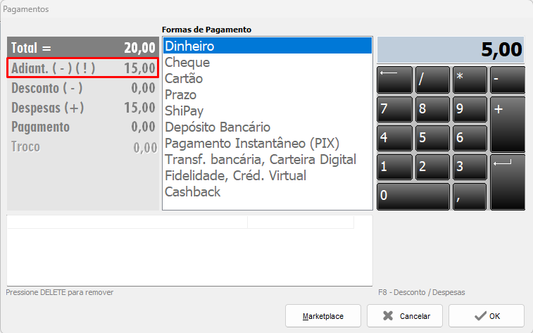 Ao clicar nessa função, será permitido realizar uma adiantamento do valor da mesa.