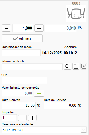 - Taxa Couvert: Notifica o valor da taxa Couvert, que poderá ser definida por ocupante da mesa ou por mesa em si, conforme cadastrado anteriormente nas configurações.