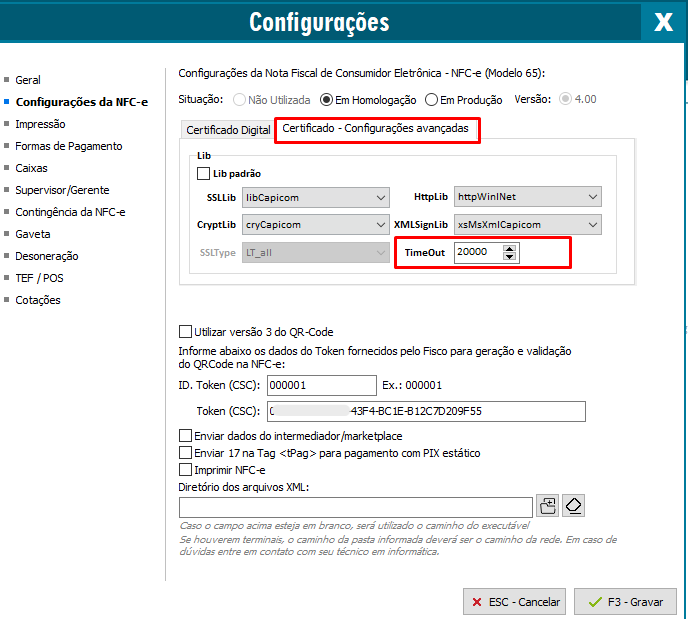 Para o erro não persistir em outras notas é possível aumentar o tempo de Timeout para 20000, dessa forma o sistema aguardar por mais tempo o recebimento de retorno da Sefaz: