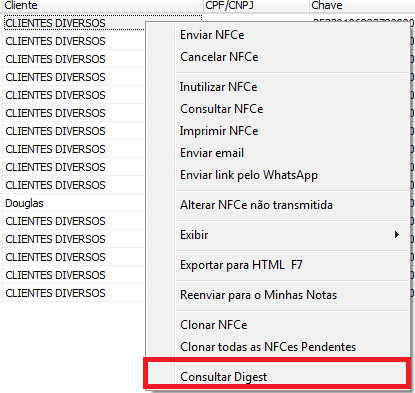 Após atualizar o sistema, localize a nota com o erro, clique com o botão direito e clique na opção Consultar Digest.