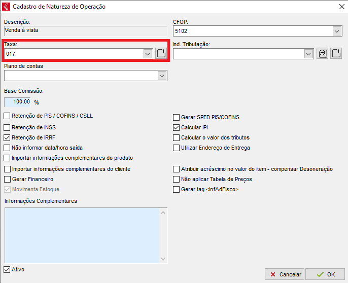 Preencha a taxa conforme a contabilidade instruir e clique em OK, poderá então reabrir a NF e transmitir.