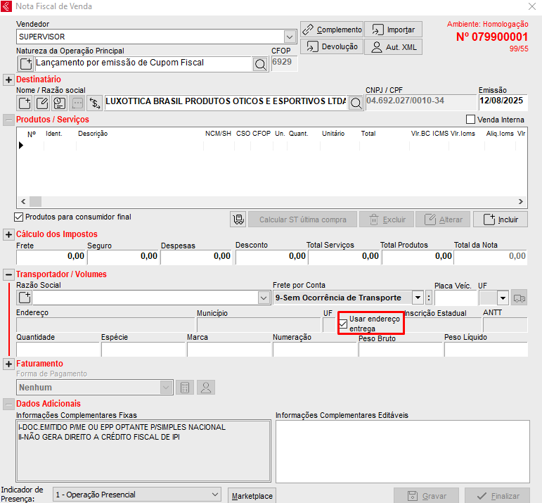 No momento da emissão da nota, ao importar o cupom, é necessário marcar a opção Usar endereço entrega.