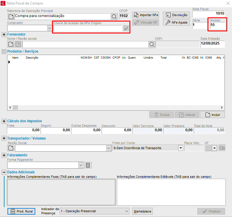 Ao efetuar uma NF-e de devolução ou de importação de cupom fiscal é retornada a seguinte mensagem: