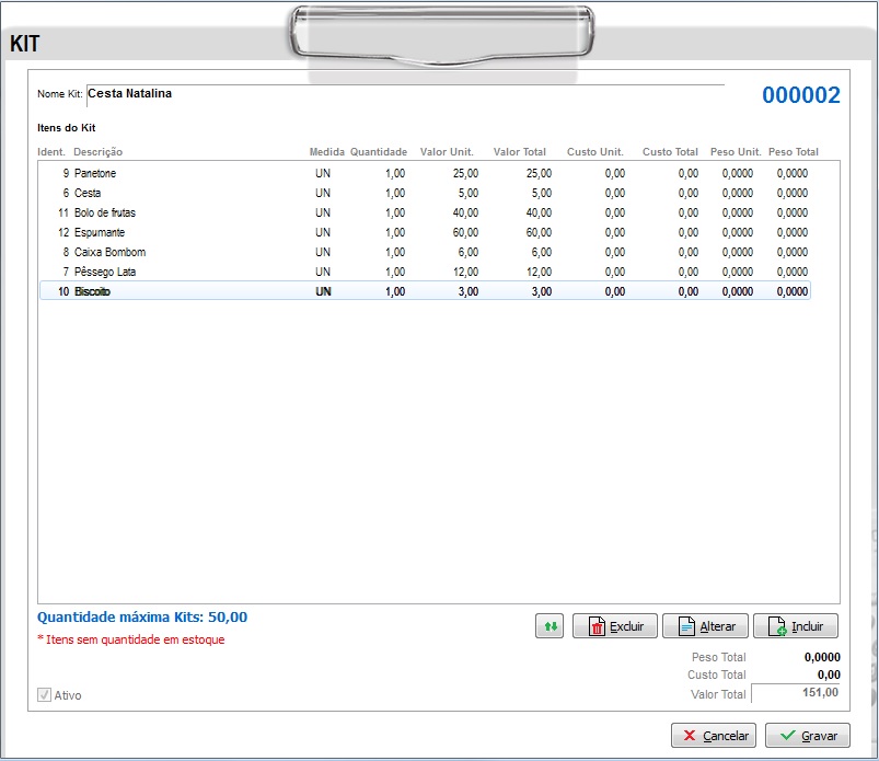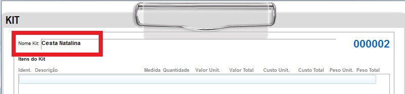 No campo Nome Kit, defina o nome do kit que você está montando, no exemplo abaixo, uma cesta natalina.