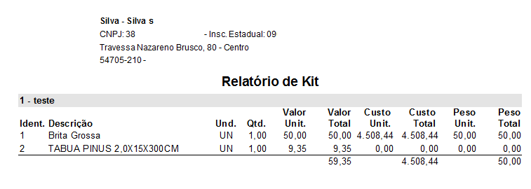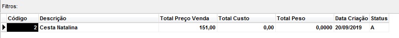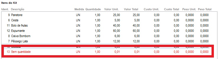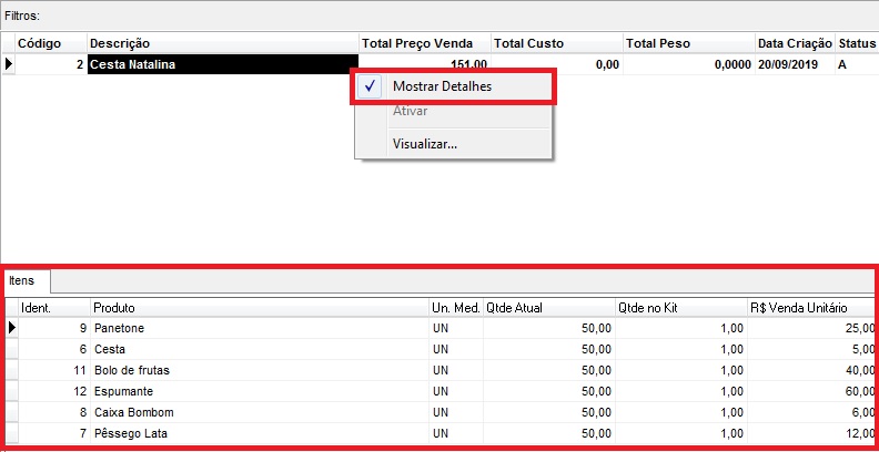 Clicando com o botão direito do mouse sobre ele, selecionando a opção mostrar detalhes, mostrará no rodapé da tela os produtos que compõe este kit: