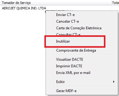 Para inutilizar um CT-e, localize o mesmo na listagem de CTes emitidos, clique com o botão direito sobre o mesmo e vá até a opção inutilizar.