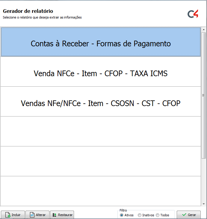 Será apresentada a tela inicial, é possível gerar os relatórios já listados inicialmente, para gerar os relatórios pré-cadastrados basta clicar sobre qual deseja e clicar no botão Gerar.
