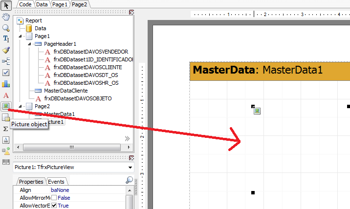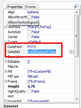 Nas propriedades, no campo DataField escolha o parâmetro FOTO, e no DataSet, escolha a variável frxDBDatasetFotos;