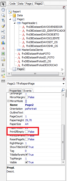 Na lateral esquerda da tela, nas propriedades, desmarque a função PrintifEmpty, de forma que apareça a descrição FALSE;