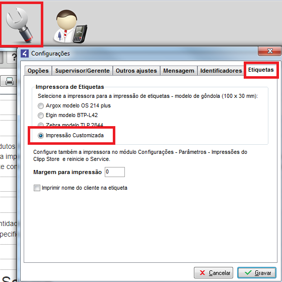É possível também customizar as etiquetas do ClippService, para configurar, clique em Configurações - Etiquetas e marque a opção Impressão Customizada.