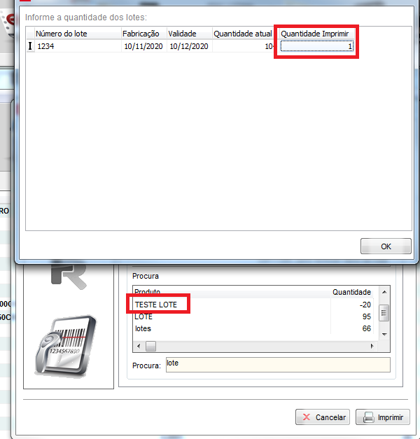 Clique duas vezes no lote que deseja imprimir e adicione a quantidade de etiquetas que deseja imprimir para o lote em questão e clique em OK para gravar, repita o processo para todos os lotes que deseja.