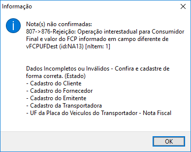 Rejeição: Operação interestadual para Consumidor Final e valor do FCP informado