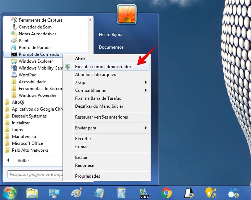 No menu Iniciar, localize o Prompt de Comando e clique com o botão direito do mouse sobre ele. Em seguida, no menu de contexto, clique em Executar como administrador.