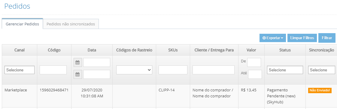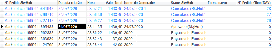 Serão apresentados os dados acima, como: Número do Pedido SkyHub (pedido interno da SkyHub), data e hora da criação do pedido, nome do comprador (cliente), status SkyHub, Forma de pagamento e número do pedido no Clipp (quando transformado em pedido).