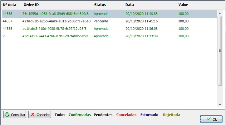 Clicando no botão Consultar irá retornar o status da transação que você selecionar.