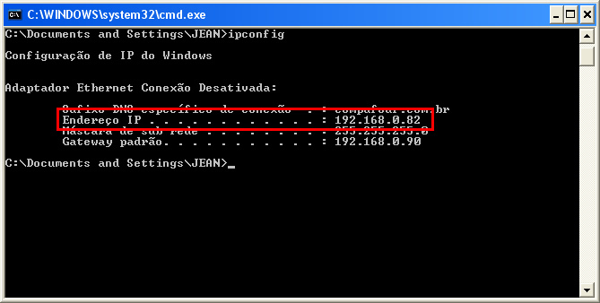 - Agora no Prompt-MSDOS digite então ipconfig e pressione Enter;