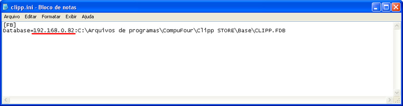 - Dentro desse arquivos temos o caminho executado pelo sistema para localizar a Base de dados, nesse arquivo devemos fazer a alteração, tirando o nome do computador e preenchendo no mesmo local o Endereço de IP, como exemplo imagem abaixo: