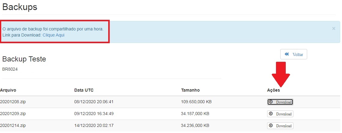 Clicando no download do backup que deseja, será disponibilizado um link para baixar o backup;