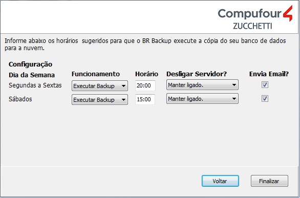 Em seguida, informe os horários para que o sistema execute a cópia do banco de dados, é possível escolher também se deseja ou não executar o backup e se o servidor será desligado ao concluir o procedimento, marcando a opção Enviar e-mail, será enviado um e-mail com as informações do backup;