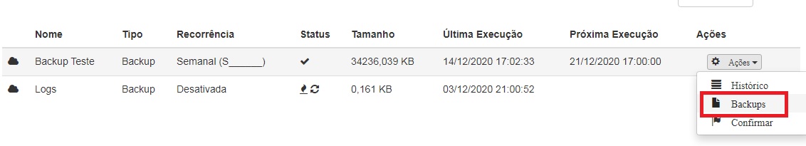 Dentro do painel, para ter acesso aos backups, clique no botão Ações - Backups;