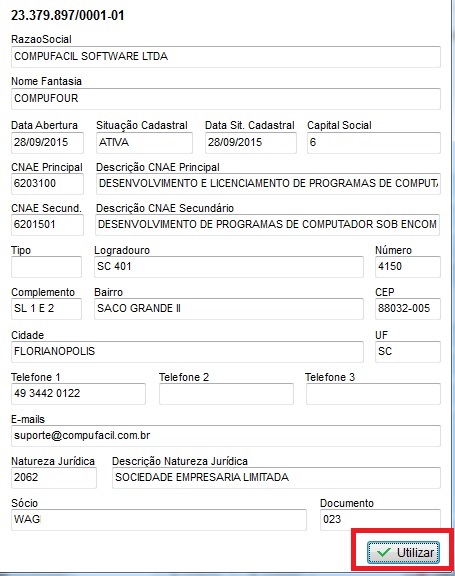 Serão retornados os dados em tela, caso concorde com os dados, clique em Utilizar;