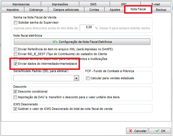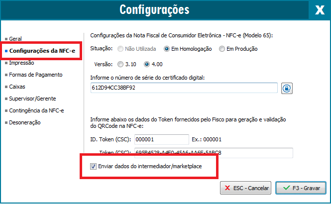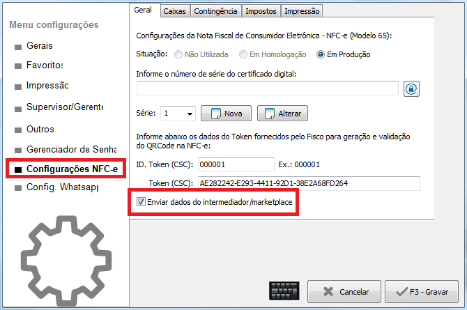 Em seguida, clique em Configurações da NFC-e e marque a opção Enviar dados do intermediador/marketplace: