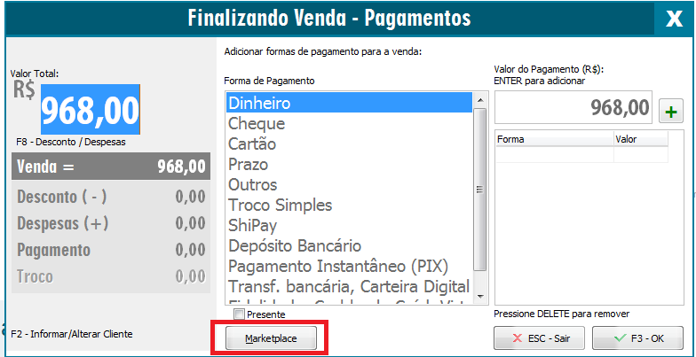 Durante a venda, na tela de finalização será possível informar o intermediador:
