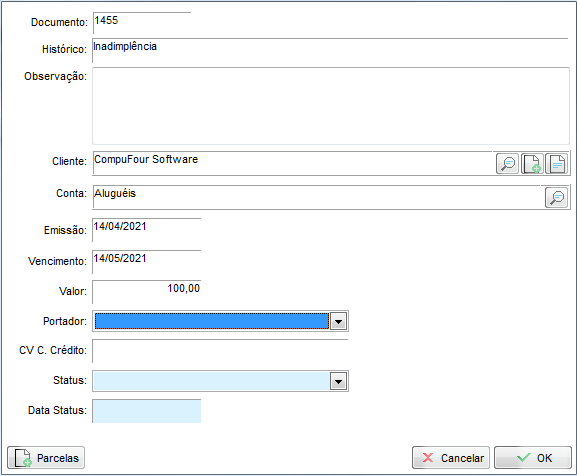 Outro exemplo de receita, é um recebimento de conta no módulo de contas a receber, aqui temos o exemplo de uma conta de R$100,00 proveniente da conta de Aluguéis, hipoteticamente seria o aluguel que sua empresa tem a receber de algum inquilino:
