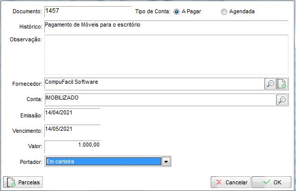 Outro exemplo de despesa, é um pagamento de conta no contas a pagar, aqui temos o exemplo de uma conta de R$1.000,00 proveniente da conta de Imobilizado: