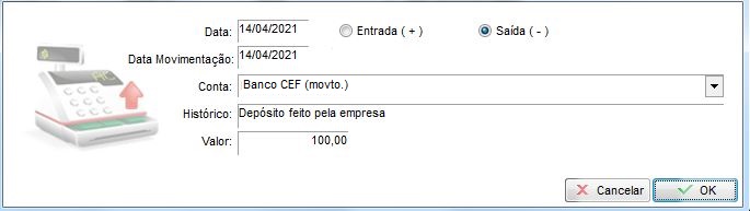 Outro exemplo de despesa são lançamentos manuais no caixa, neste caso sairá R$100,00 do caixa geral, como destino para conta Caixa Econômica;