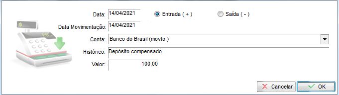 Outro exemplo de receita são lançamentos manuais no caixa, neste caso entrará R$100,00 no caixa geral, proveniente da conta Banco do Brasil;