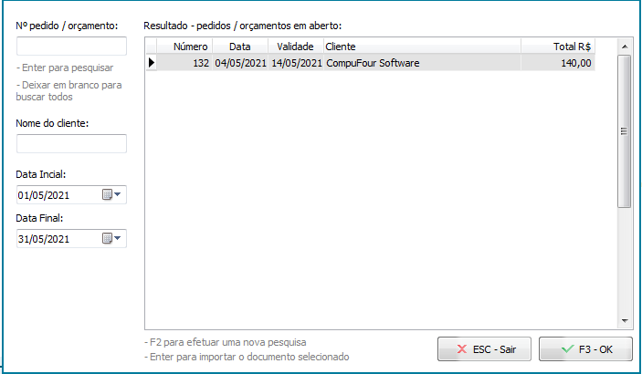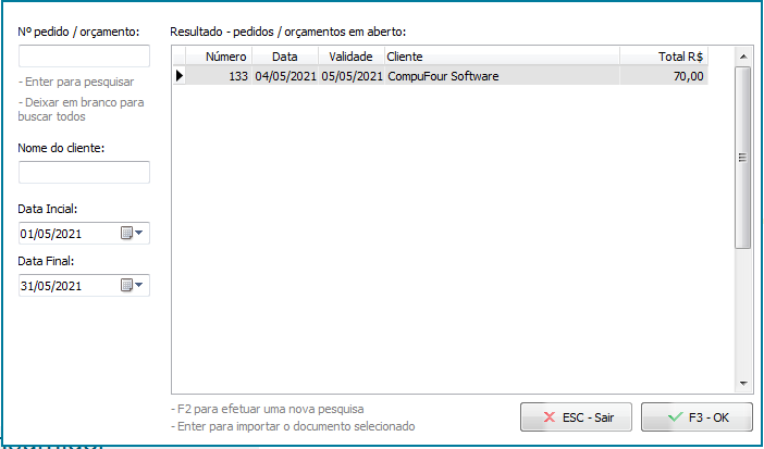 Em seguida, escolha o pedido consignado lançado previamente e pressione F3 - OK;