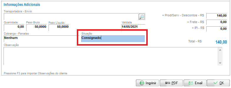 Após lançar o pedido de venda consignado, clique em OK (caso queira saber mais sobre pedidos de venda, clique aqui)