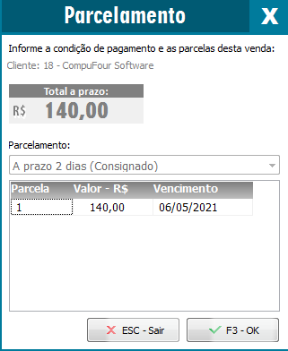 Na finalização da NFC-e, será apontado o parcelamento escolhido como padrão nas configurações do consignado;