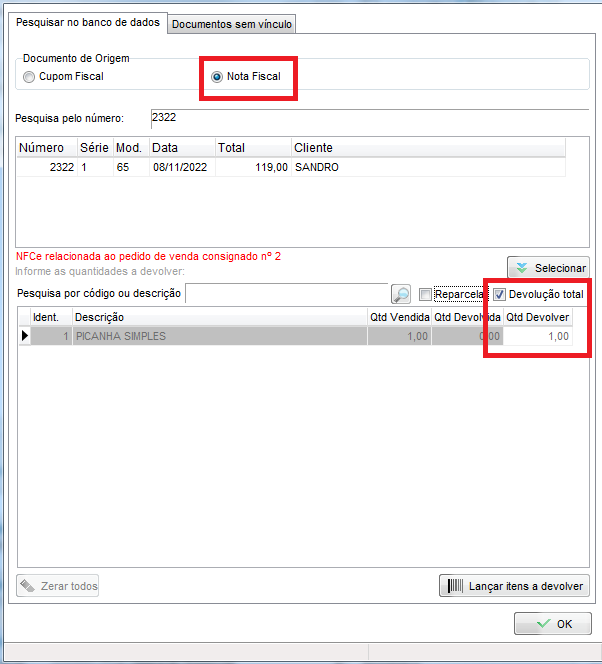 Marque a opção Nota Fiscal e informa o número da NFC-e a ser devolvida, desmarque a opção Devolução Total e defina quantidade a devolver apenas nas mercadorias que o cliente não quis;