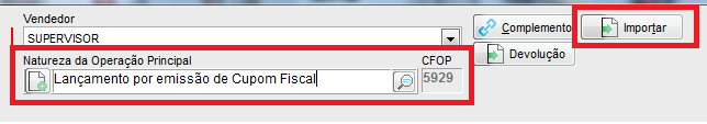 Após abrir uma nova nota, escolha o CFOP 5929 - Lançamento efetuado em decorrência de emissão de documento fiscal em seguida, clique no botão Importar;