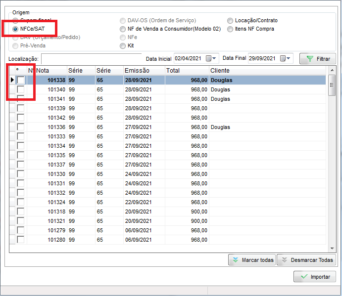 Marque a opção NFC-e/SAT e marque o checkbox da NFC-e que deseja importar;