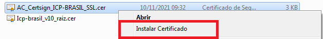 Descompacte todos os arquivos da pasta, em seguida acesse a pasta em questão, veja que existem duas cadeias, instale cada uma individualmente, clicando com o Botão direito do Mouse - Instalar Certificado;