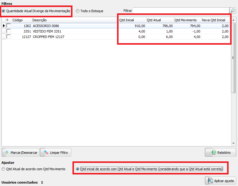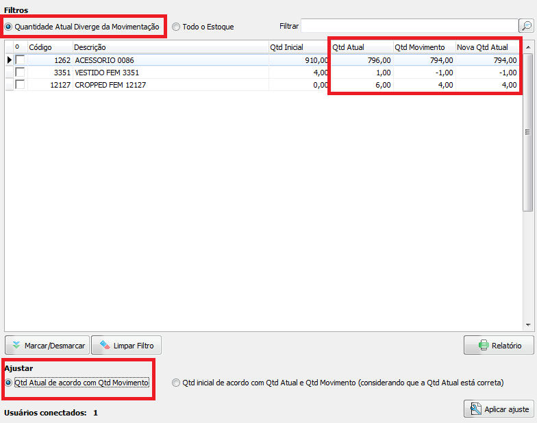 Normalmente utiliza-se a marcação da opção Quantidade atual diverge da movimentação, dessa forma, o sistema irá ler os itens que tem a quantidade atual diferente da quantidade total com base nas movimentações, marque a opção Qtd Atual de acordo com a Qtd Movimento;