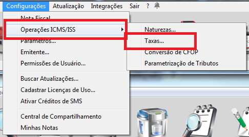 Para alterar a alíquota geral de ICMS de seu estado, acesse Configurações - operações ICMS/ISS - Taxas;