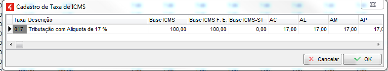 Caso seja necessário, altere a descrição da Taxa (clicando duas vezes no campo) e adicione o percentual da alíquota em cada estado;