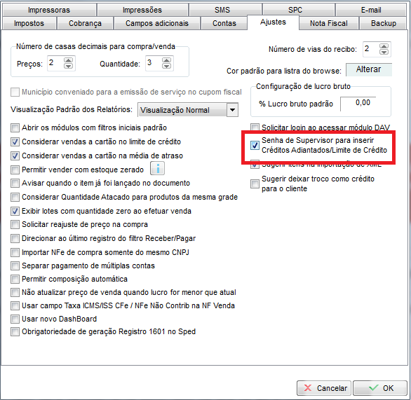 Dica! Caso queira limitar seus funcionários na inserção de crédito a clientes, acesse Configurações - parâmetros - ajustes e marque a opção "Senha de Supervisor para inserir Créditos Adiantados/Limite de crédito"